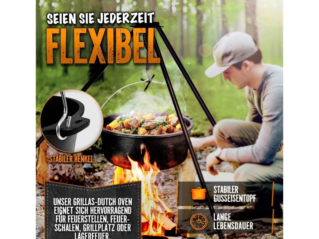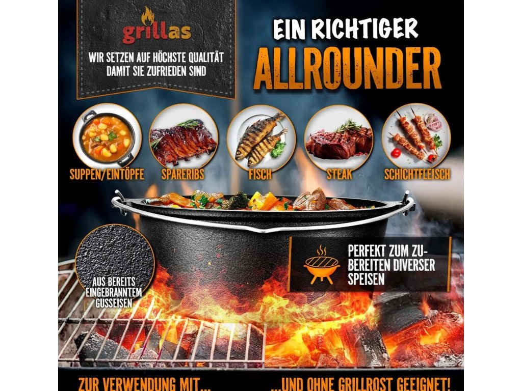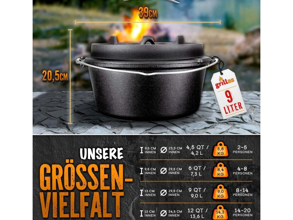 Grillas® Dutch Oven Set – 9 litrov – ideálny na varenie a pečenie na ohni alebo grile.
