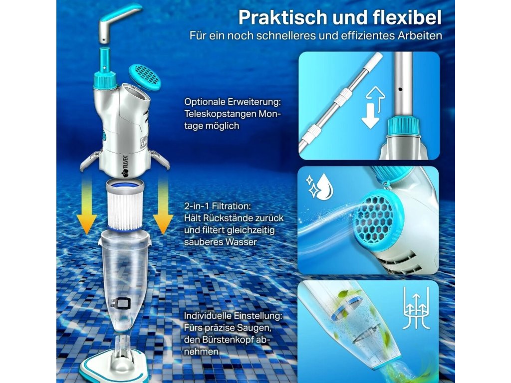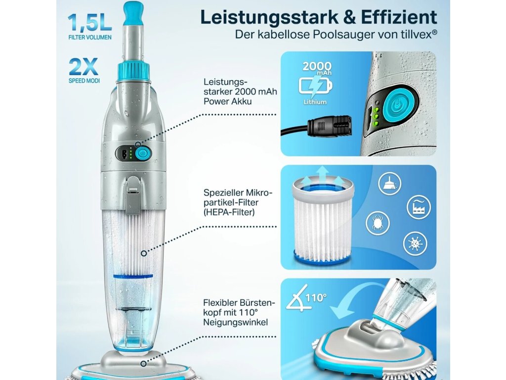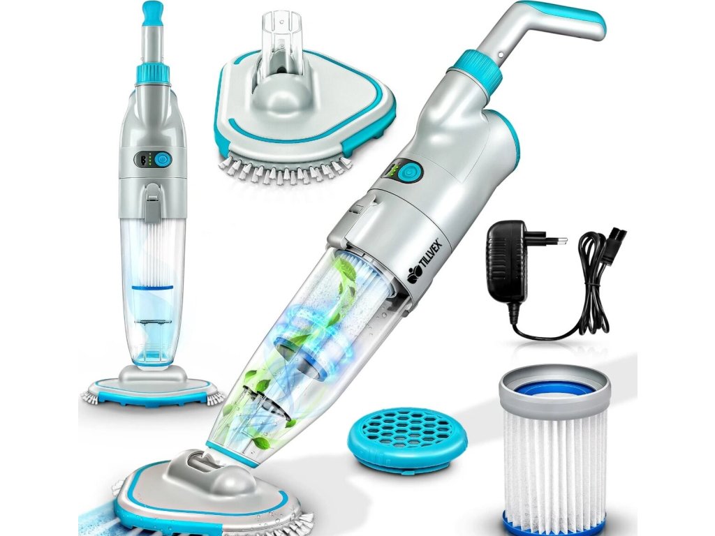 tillvex® elektrický vysávač do bazéna – praktický ručný čistič s nabíjateľnou batériou a filtrom.