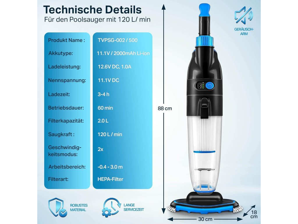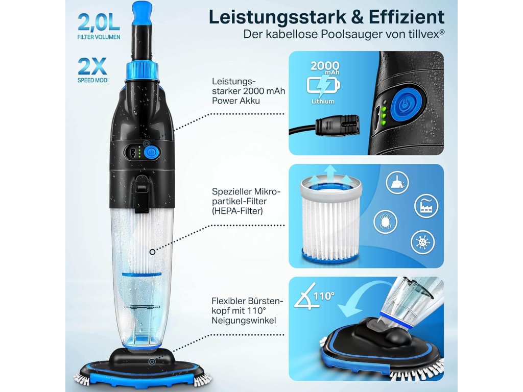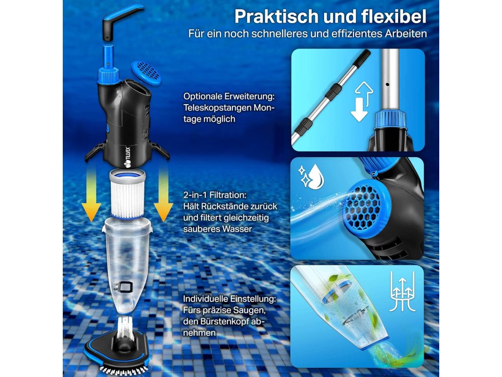 Tillvex® elektrický vysávač na bazén – praktický bezdrôtový čistič bazénového dna s filtrom.