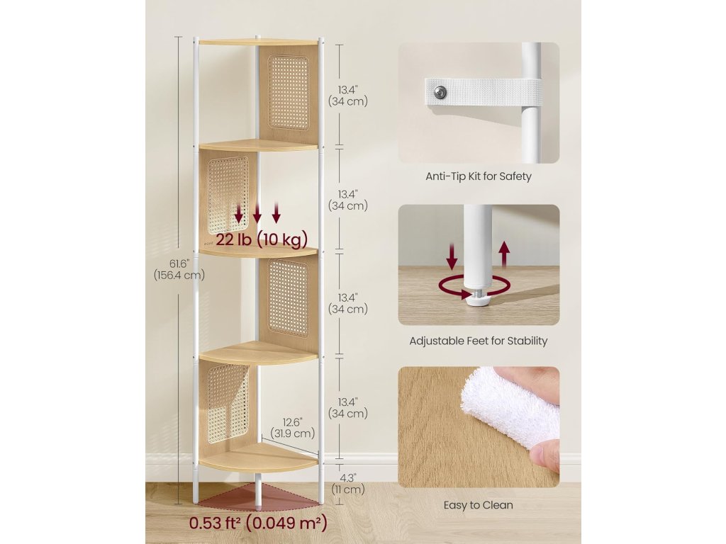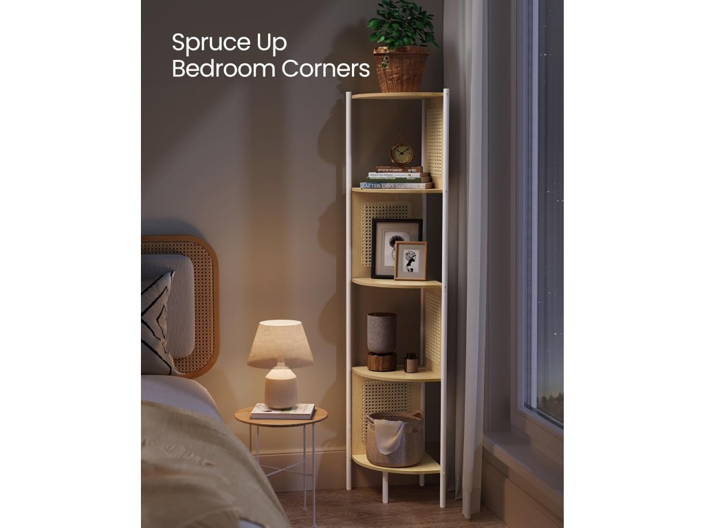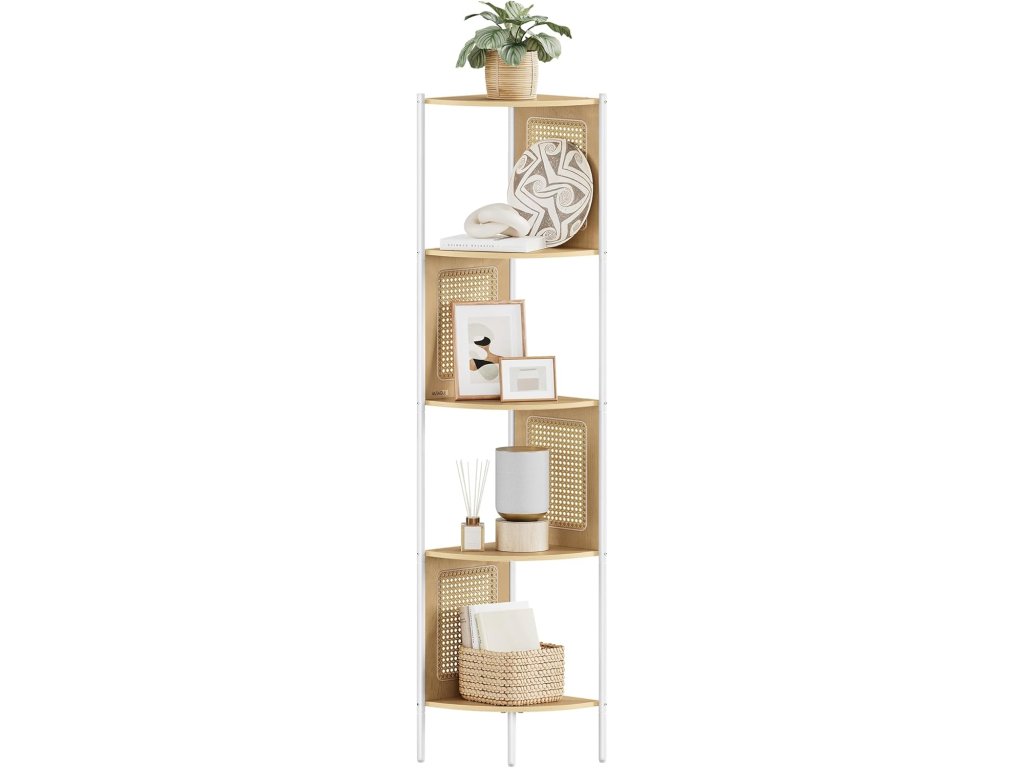 Rohový regál VASAGLE v boho štýle – ideálny na knihy, kvety alebo dekorácie do obývačky, spálne, pracovne či kuchyne.